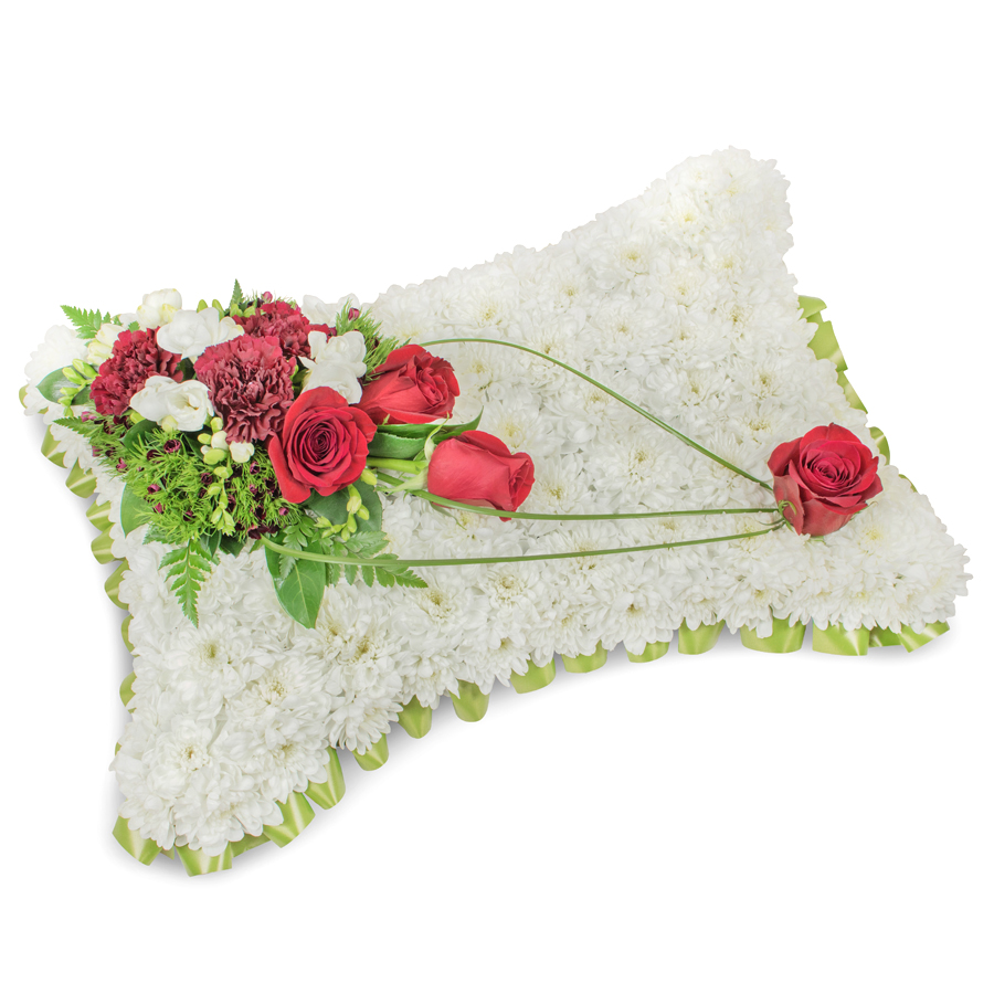 Show your heartfelt sympathy with our luxurious condolence bouquet, combining white chrysanthemums, red roses, white freesias, and dark red carnations. Accented with dianthus and bear grass, this unique arrangement is designed to convey your deepest emotions.