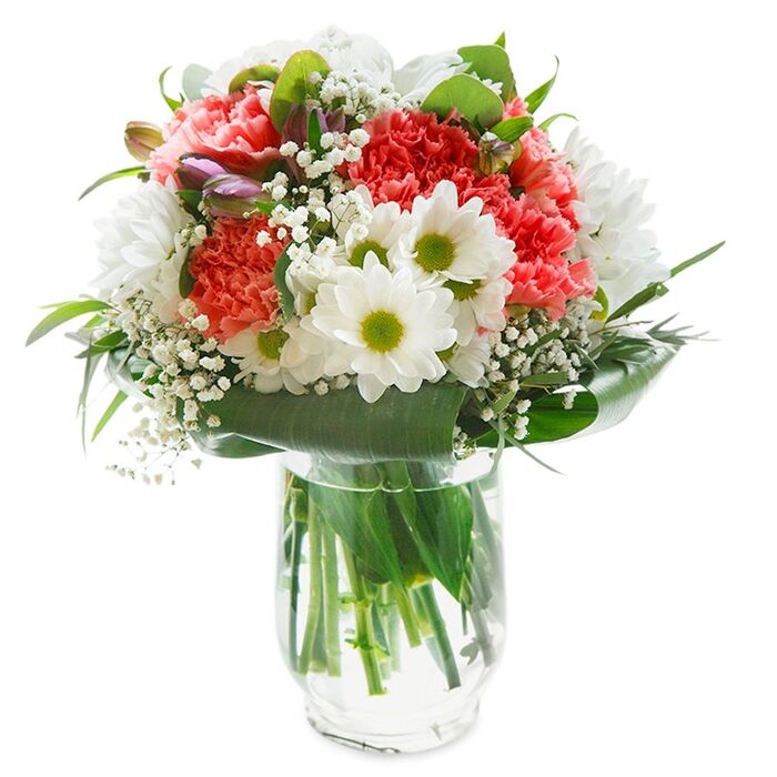 Present a memorable gift with our unique and stunning flower arrangement. This elegant bouquet features pure white chrysanthemums, delicate gypsophila, and soft light pink carnations, beautifully arranged with lush aspidistra leaves.
